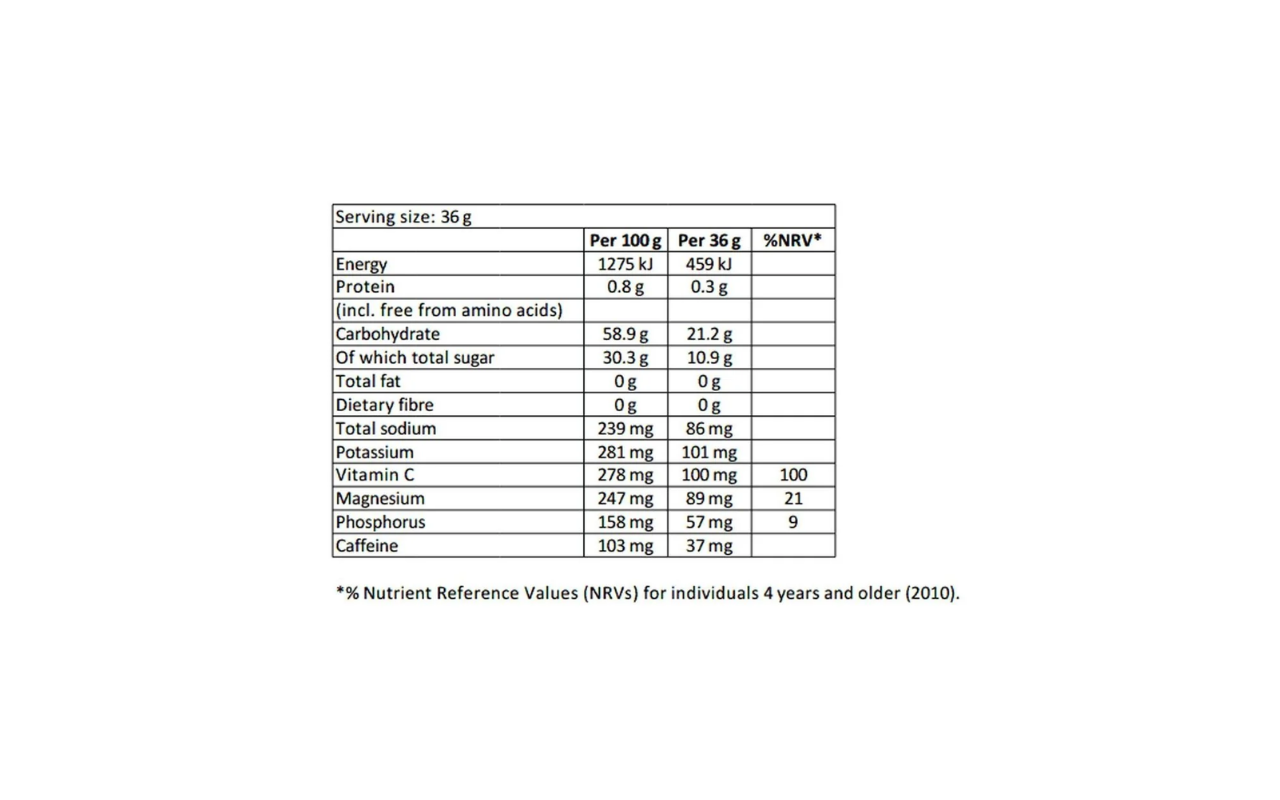 Maltodextrin syrup, Reversed osmosis water, Fructose, Magnesium lactate, Pectin citrate, L-taurine, Potassium citrate, Di-sodium phosphate,